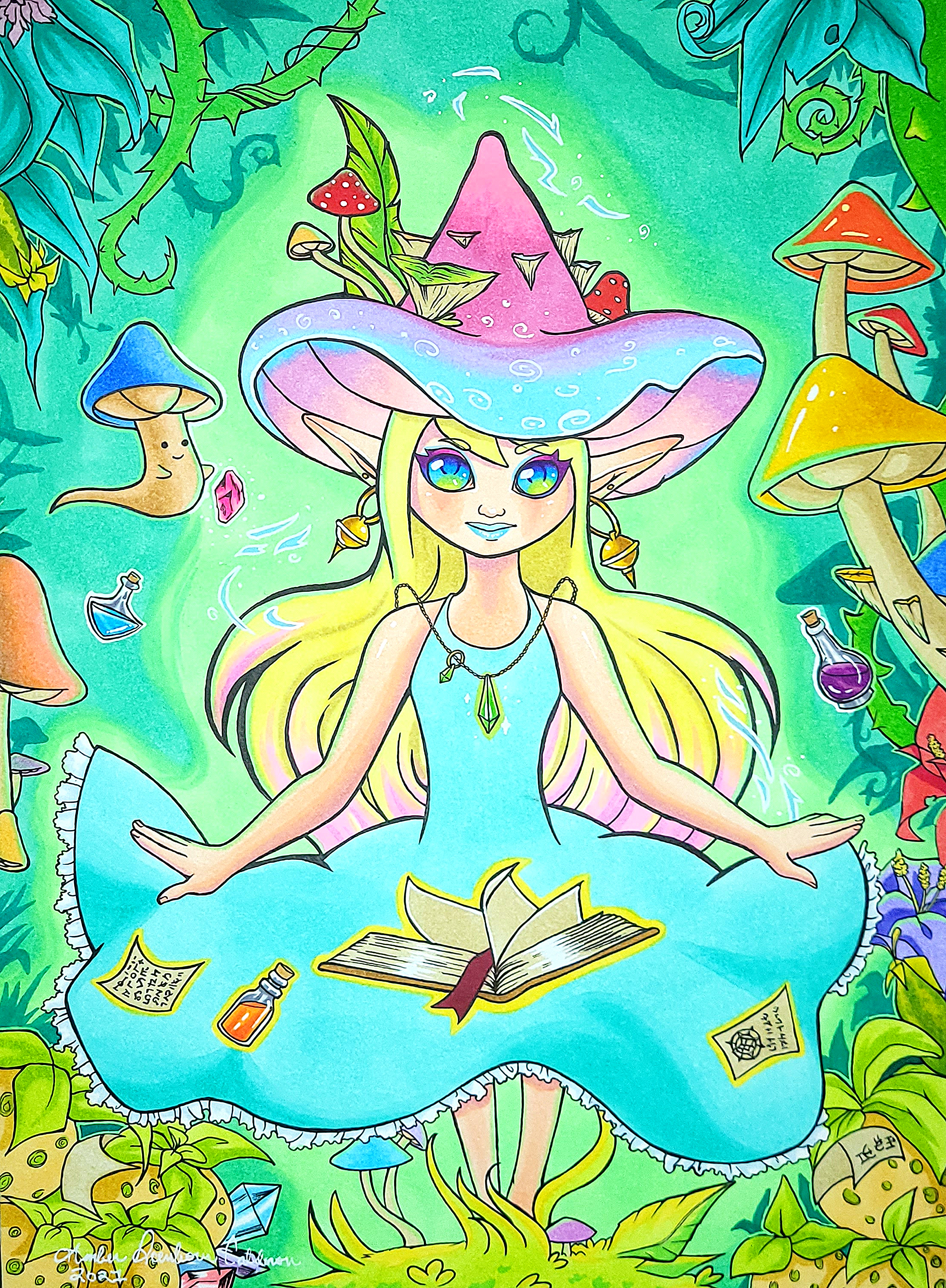 Wake the Forest Alcohol Marker Piece features a young witch casting spells to revitalize the forest. She has a helpful mushroom friend helping her along the way. This piece is currently for sale.